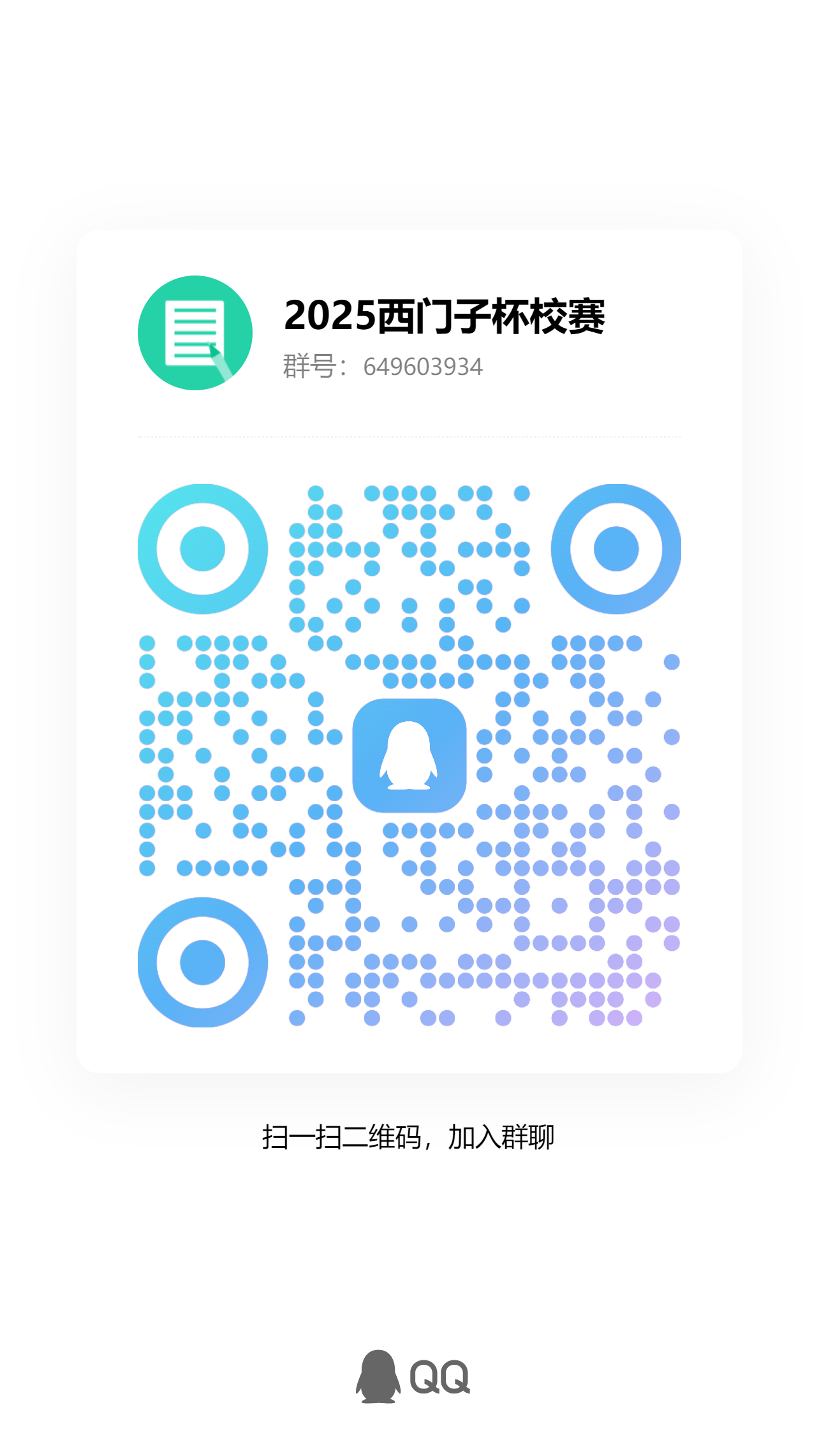 1.校赛报名:2025年4月21日——2025年4月27日,自由组队报名。参赛队伍必须于2025年4月27日(周日)12点前加入QQ群:649603934。