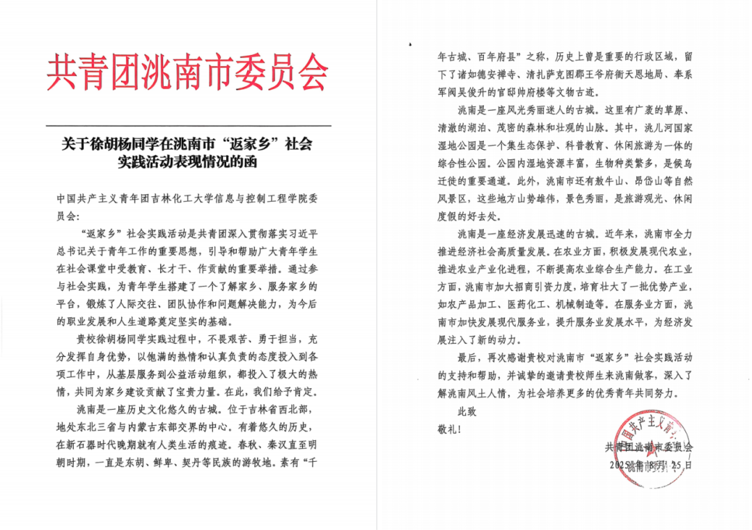 我校的徐胡杨同学在暑期的“返家乡”社会实践活动中积极参与活动,用心用力付出。在得到了宝贵的实践经验的同时,收获了当地人民的认可尊重。为此共青团洮南市委员会特发来徐胡杨同学的“返家乡”社会实践活动函给予表扬。