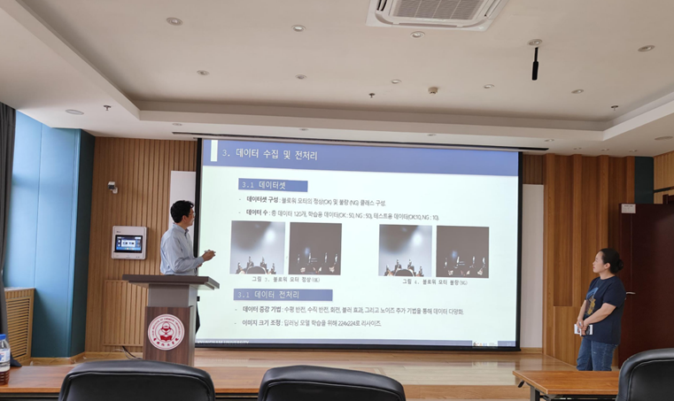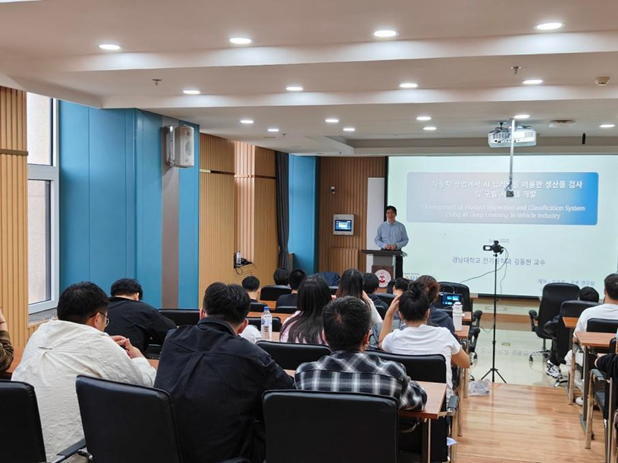 报告会上,金东宪教授以“基于AI深度学习的汽车产品智能检测与区分系统开发与应用”为主题,从提升汽车制造质量与效率的关键需求切入,系统阐述了深度学习算法在零部件缺陷自动识别、装配精度在线监测、产品型号智能分类等核心场景中的技术原理与应用方案。通过丰富的工业案例演示,金教授生动展示了AI系统如何实现高精度、高效率的自动化视觉检测,显著降低人工成本并提升产品良率。